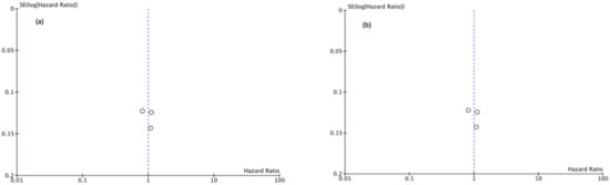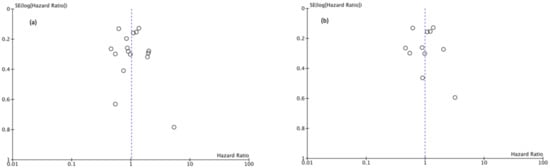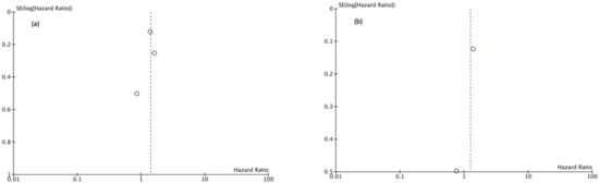 (a) Funnel Plot OS 5y, (b) Funnel Plot OS 10y.
