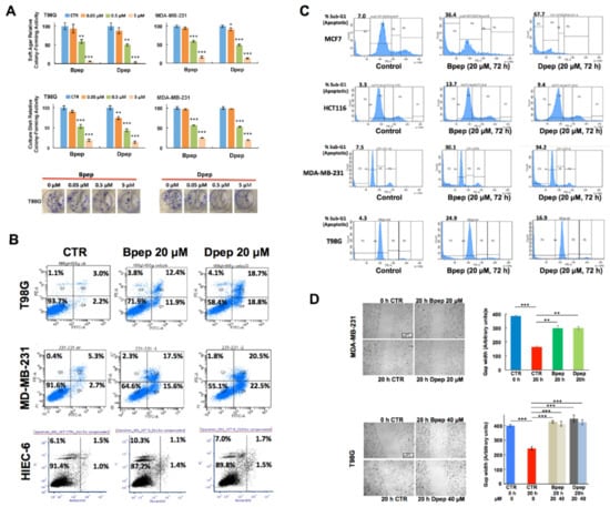 Bpep and Dpep inhibited colony formation, promoted apoptosis of cancer cells and suppressed tumor cell migration. (A). Bpep and Dpep suppressed colony formation by multiple cancer cell lines. The upper panel shows relative colony formation on soft agar after 12 days of treatment with indicated concentrations of Bpep or Dpep. p values vs. control are indicated as described in the legend of Figure 1. The middle panel shows relative colony formation on culture dishes after 12 days of treatment with indicated concentrations of Bpep or Dpep. The lower panel shows images of colonies growing on culture dishes and treated with indicated concentrations of Bpep or Dpep. The experiment was repeated 3 times in triplicate with comparable results. (B). Bpep and Dpep promoted apoptosis of cancer cells, but not of non-transformed cells, as assessed by flow cytometry of Annexin V-FITC/PI-stained cells. Cells were treated with 0 (control, CTR) or 20 µM Bpep or Dpep for 3 days prior to analysis. Numbers indicate the proportion of cells in corresponding quadrants, with early apoptotic and late apoptotic cells in the lower and upper right quadrants, respectively. Data are from one of two independent experiments, each with comparable results. (C). Bpep and Dpep promoted apoptosis of multiple cancer cell types as assessed by flow cytometric analysis of sub-G1 DNA levels in PI-stained cultures. Cultures were treated with 0 or 20 µM Bpep or Dpep for 3 days prior to analysis. Values at the upper left of each plot represent % of sub-G1 signal relative to total signal. Data represent results of one experiment. (D). Bpep and Dpep inhibited migration of MDA-MB-231 and T98G cells. Replicate cultures in two independent experiments were submitted to scratch assays and then treated for 20 h with indicated concentrations of Bpep or Dpep. Cultures were photographed at the time of scratch application and 20 h after treatment. Representative images show scratch width at the time of scratch and 20 h later under indicated conditions. Graphs in the right panels show relative gap widths at indicated times and the conditions of treatment for each cell line. Peptide concentration in the upper graph is 20 µM. p values are indicated vs. 20 h control (n = 3–16). * p < 0.05, ** p < 0.005, *** p < 0.0005.