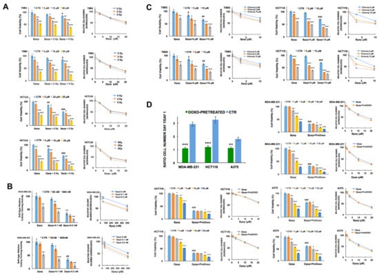 ATF5, CEBPB and CEBPD have been reported to contribute to cancer cell radiation resistance [12,14,24]. To assess Bpep and Dpep in combination with radiation treatment, T98G and HCT116 cells (representing cancer types treated with radiotherapy) were either co-exposed to gamma radiation and the peptides, or irradiated and one day later subjected to peptide treatment. In both cases, comparison with untreated and monotherapy-treated cells indicated that the peptides did not preclude response to radiation and (as seen in normalized plots) that the peptides acted approximately additively to somewhat synergistically with radiation to suppress tumor cell growth/survival (co-treatment: T98G, CI = 0.74 ± 0.04 for Bpep, 0.84 ± 0.07 for Dpep; HCT116, CI = 0.93 ± 0.06 for Bpep, 0.92 ± 0.08 for Dpep. Radiation pre-treatment: T98G, CI = 0.61 ± 0.05 for Bpep, 0.68 ± 0.07 for Dpep; HCT116, 0.89 ± 0.04 for Bpep, 0.86 ± 0.05 for Dpep) (Figure 3A; Supplementary Figure S4A). Similar results were achieved with Dpep and T98G cells as determined by colony formation in soft agar (Supplementary Figure S4B). Although there were too few points to calculate a CI value, an apparent synergistic effect was particularly evident in the combination of 5 µM peptide with 5 Gy.
