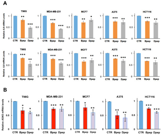 If, as anticipated, Bpep and Dpep interfere with CEBPB and CEBPD function, they should affect expression of direct CEBPB/CEBPD targets. IL6 and IL8 have been identified as direct CEBPB and CEBPD targets [48,49], and there is evidence that cancer-cell-derived IL-6 and IL-8 promote tumor growth and metastasis and therapeutic resistance [50,51]. We therefore assessed IL6 and IL8 transcript levels in multiple cancer lines with or without 48 h of 20 µM Bpep or Dpep exposure. In each case, the peptides significantly reduced IL6 and IL8 expression (Figure 4A).