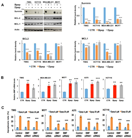 Bpep and Dpep depleted survivin and elevated BMF in multiple cancer cell lines of various origins, and BMF was required for Dpep-promoted cancer cell apoptosis. (A). Bpep and Dpep suppressed expression of pro-survival proteins, including survivin. Indicated cancer cell lines were exposed to 0 or 20 µM Bpep or Dpep for 3 days and then assessed by Western immunoblotting for levels of BCL2, MCL1 and survivin proteins with actin as a loading control. The upper left panel shows representative blot. Remaining panels show quantification of survivin, BCL2 and MCL1 relative to actin in three independent experiments. p values vs. control are indicated by * as in Figure 1. (B). Bpep and Dpep upregulated BMF in multiple cancer cell lines. Cultures were treated with 0 (CTR) or 20 µM peptides for 2 days as indicated and then assessed by qPCR for relative levels of BMF transcripts. Data represent pooled values from 3 independent experiments carried out in triplicate. p values vs. control are indicated by * as in Figure 1 (C). Knockdown of BMF expression with siRNAs protected cancer cell lines from apoptosis promoted by Dpep (20 µM). Data are from one experiment carried out in sextuplicate. Cultures were pretreated with control siRNA, BMF-siRNA1 or BMF-siRNA2 for 2 days and then with 20 µM Dpep for an additional 2 days before assessment for the proportion of cells with apoptotic nuclei. p values for peptide-untreated vs. peptide-treated for each condition are indicated by * as in Figure 1. * p < 0.05, ** p < 0.005, *** p < 0.0005.