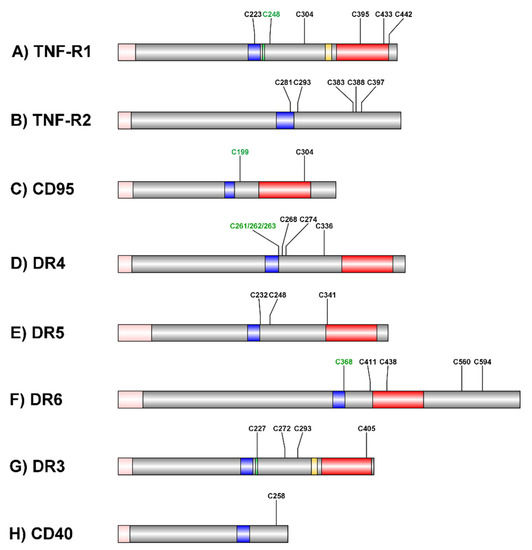 Palmitoylation of TRAIL-R1 (DR4) at membrane-proximal cysteine residues 261/262/263 is critical for DR4 lipid raft localization, oligomerization, and consequently, cell death induction [144]. Besides the described cysteine residues, DR4 comprises four more potential palmitoylation sites (Cys 268, 274, 279, and 336); none of these sites have been reported to be palmitoylated (Figure 1D). The TRAIL-R2 (DR5) amino acid sequence contains three putative palmitoylation sites (Figure 1E). The protein has not been reported to be palmitoylated so far.
