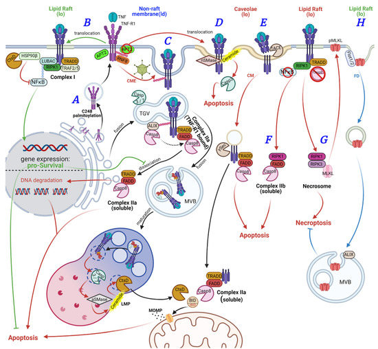 TNF-R1 signaling pathways. (A) TNF-R1 palmitoylation at cysteine residue 248 facilitates its transport from the Golgi-apparatus to the non-raft/liquid-disordered (ld) environment of the plasma membrane. (B) Binding of TNF to TNF-R1 activates APT2, resulting in partial de-palmitoylation of TNF-R1 and receptor translocation to a liquid-ordered (lo) plasma membrane compartment (lipid raft). In lipid rafts, pro-survival signaling via complex I formation and NFκB is initiated. Translocation of NFκB to the nucleus induces transcription of pro-inflammatory/pro-survival genes, inhibiting cell death induction. (C) Activated TNF-R1 is ubiquitinated by RNF8, leading to clathrin-mediated endocytosis of the receptor. The resulting TNF-receptosomes fuse with trans-Golgi vesicles (TGV) to recruit, i.e., caspases. At internalized TNF-R1, complex I is modified in favor of complex IIa. Complex IIa can dissociate from the receptor and elicit its apoptosis, inducing function in the cytoplasm. TNF-receptosomes can alternatively be integrated into multivesicular bodies (MVB), which maturate to lysosomal vesicles by acidification. In lysosomes, the receptosome membrane is degraded, and a multi-enzyme cascade results in aSMase activation, ceramide formation, and ultimately Cathepsin D (CtsD) activation and lysosomal membrane permeabilization (LMP). Activated CtsD translocates into the cytoplasm to hydrolyze HSP90β or activates Bid to truncated Bid (tBid). tBid translocates to mitochondria and drives mitochondrial outer membrane permeabilization (MOMP), boosting apoptosis induction by cytochrome C release and apoptosome formation. (D) Inhibition of APT2 results in translocation of active TNF-R1 to caveolae, where nSMase is activated, resulting in ceramide formation at the plasma membrane, caspase activation, and apoptosis induction. (E) In caveolae, activated TNF-R1 can be shed by TACE followed by clathrin-independent internalization of the TNF-R1 TMD/cytoplasmic tail, where pro-apoptotic complex IIa can be recruited. γ-secretase can release complex IIa into the cytoplasm. (F) Aberrant NFκB signaling results in formation of RIPK1-dependent pro-apoptotic complex IIb and its release into the cytoplasm. (G) Inhibition or lack of caspase-8 enzyme activity impedes complex II formation in favor of necrosome formation and necroptosis induction. Necroptosis induction involves plasma membrane pore formation upon MLKL phosphorylation, resulting in cell swelling and bursting. (H) This can be counteracted by flotillin-dependent endocytosis of pMLKL and sorting via ALIX positive MVB towards lysosomal degradation or release as exosomes. TNF-R1-mediated MAPK or JNK signaling is not shown.