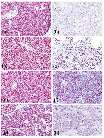 Immunoreactivity of the mismatch repair proteins in Merkel cell carcinoma (magnification, ×200). High expression (all MCPyV-positive cases) is shown on the left side: MLH1 (a), MSH2 (c), MSH6 (e), and PMS2 (g); and low-level expression (all MCPyV-negative cases) on the right side: MLH1 (b), MSH2 (d), MSH6 (f), and PMS2 (h).