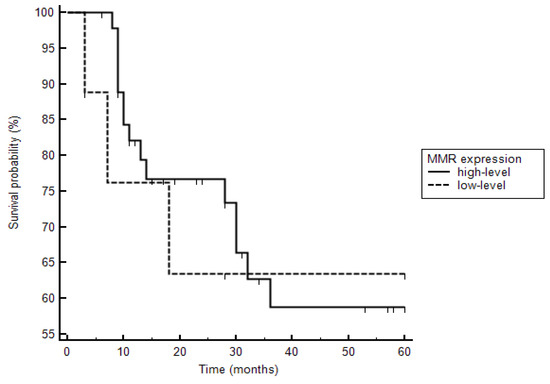 Kaplan–Meier curves are demonstrated with respect to deaths in patients with high- and low-level mismatch repair protein (MMR) expression. Three of six patients with low-level MMR expression died, whereas 15 of 47 patients with high-level MMR expression died (hazard ratio: 1.2, CI 0.31 to 4.3; p = 0.81).