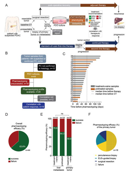 Feasibility of organoid-based precision medicine in clinical routine. (A), Schematic representation of the work-flow. Patient-derived organoids (PDOs) were isolated from surgical specimens or biopsy samples of the primary tumor or liver metastases in pancreatic cancer (PC) patients. PDOs were submitted to pharmacotyping, phenotyping, and biobanking. The in vitro prediction was compared to the therapeutic response in the patient. (B), Schematic representation of the study. (C), Graphic representation showing the time required before PDO pharmacotyping. (D), Representation of the overall PDO pharmacotyping efficacy. (E), Representation of the pharmacotyping efficacy in PDOs isolated from liver metastases of either treatment-naïve or pretreated patients, or from the primary tumor. (F), Pie chart showing the pharmacotyping efficacy of the primary tumor according to the sampling method (percutaneous biopsy, n = 11; endoscopic ultrasound (EUS)-guided biopsy, n = 3; surgical resection, n = 2); dotted pattern depicts pharmacotyping failure. 5-FU, 5-fluorouracil; GEM, gemcitabine; IRI, irinotecan; OX, oxaliplatin; PAC, paclitaxel; CT, computed tomography; ns, not significant.
