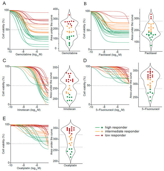 PDO drug sensitivity was assessed by calculating the area under the curve (AUC) upon testing single chemotherapeutic agents. Previously, we showed that the efficiency of a combinatorial regimen is driven by the most potent agent [15]. Thus, testing single compounds offers the advantage to possibly combine potent drugs in novel combinations, while avoiding ineffective substances and thereby toxicity. PDOs exhibited heterogeneous responses to the tested chemotherapies (Figure 2A–E and Figure S4B–G), but robustly operated across various experiments and experimenters (Figure S1A–D). Next, we employed the previously reported Jenks Natural Breaks classification method to prospectively cluster and rank each PDO line—this classifier reduced variance best within a group, while maximizing variance between groups [13,15]. According to the cut-off value for each drug determined by this method, PDO lines could be classified into three subgroups: lowest AUC was defined as high responder, and highest AUC was termed low responder, referring to a negative prediction in terms of efficacy. The third group comprised the intermediate responder group suggesting a limited efficacy in vivo (Figure 2A–E). Best PDO response discriminations were obtained with gemcitabine (high sensitivity AUC < 146.1 and low sensitivity > 231.3) and paclitaxel (high sensitivity < 188.7 and low sensitivity > 280.3) (Figure 2A,B). In contrast, irinotecan, 5-fluorouracil (5-FU), and oxaliplatin induced more homogenous responses across the tested dosages (Figure 2C–E). 5-FU and oxaliplatin were the least effective substances among the five tested (no viability reduction above 50% for 5-FU), while irinotecan induced cytotoxicity at higher dosages, in line with previous literature [19] (Figure 2C–E).