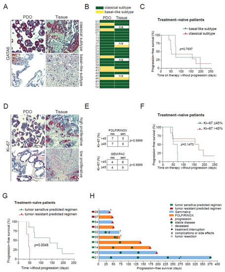 Several tissue markers have been proposed to have a prognostic impact on PC. As such, GATA6 expression allows a distinction between classical and basal-like subtypes [26]—with the latter being associated with chemoresistance and poor prognosis [27,28,29], while a high Ki-67 proliferation index is considered to have a negative impact on disease-free survival [30,31,32]. All available PDOs with the corresponding tumor tissue were evaluated for GATA6 and Ki-67 expression by immunohistochemistry (Figure 4A,D). The classical subtype was found in 85.7% (18/21) of tissue specimen and in 76.0% (19/25) of PDOs, while the basal-like subtype was encountered less frequently (14.3% (3/21) and 24.0% (6/25), respectively). Concordance between PDOs and corresponding tissue samples was 76.2% (16/21) with a certain drift towards the basal-like subtype upon establishment of PDO cultures [25] (Figure 4B). Of note, a high proliferation index in the PDO did not impact chemosensitivity in vitro (Figure 4E). Stratification of the entire cohort, as well as the treatment-naïve patient cohort according to their molecular subtype in the PDO, did not reveal significant differences in progression-free survival (PFS) (Figure 4C). A trend towards a longer PFS was observed in patients with a high proliferation rate in the PDO, which did not reach statistical significance (p = 0.1479) (Figure 4F). To challenge our predictions for the putative clinical value of a PDO-informed treatment in terms of outcome, we compared the PFS of previously treatment-naïve patients with advanced PC who underwent chemotherapy with regimens that were predicted to be either sensitive or resistant. Contrasting with subtype and proliferation, the administration of the tumor sensitive predicted therapy indeed led to a significantly longer patient PFS in the treatment-naïve cohort (mPFS 141 vs. 47 days, p = 0.0048) (Figure 4G,H).