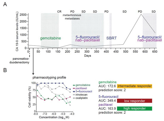 A 76-year-old female patient with pancreatic head cancer underwent a pancreaticoduodenectomy with radical lymphadenectomy (pT2, pN1 (3/25), cM0) (Figure 5A). PDOs were established from the surgical specimen, and the pharmacotyping profile was available before initiation of adjuvant chemotherapy with gemcitabine after R1 resection (pharmacotyping available at day 32, treatment start day 64 postsurgery) (Figure 5B). Restaging after three months of adjuvant treatment showed no evidence of disease. Due to putative gemcitabine-related pneumonitis requiring hospitalization, treatment had to be interrupted, and the CT scan after two months of treatment break showed metachronous liver and lymph node metastases concurrent with increasing CA 19–9 values. A second-line palliative treatment with nab-paclitaxel—in combination with 5-fluorouracil for putative synergistic effects and due to intolerance to gemcitabine [33]—was administered, which achieved a long-lasting tumor control in accordance with the PDO pharmacotyping profile. A break in the systemic treatment, due to stereotactic body radiation therapy (SBRT) of a single progressive retroperitoneal lymph, eventually led again to tumor progression, which could be stabilized by re-induction with 5-fluorourcil and nab-paclitaxel. This clinical case shows that PDO-educated decision-making is feasible in first and second-line therapy and may provide clinical benefit.