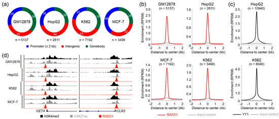 Although RAD51 plays a central role in HR, recent studies using chromatin immunoprecipitation followed by sequencing (ChIP-seq) revealed that RAD51 binds to transcriptionally active sites [28,29], suggesting a potential role for RAD51 in gene regulation. To investigate a novel role of RAD51 in regulating genes, we reanalyzed RAD51 ChIP-seq data deposited in the encyclopedia of DNA elements (ENCODE) database (https://www.encodeproject.org/, accessed on 12 March 2021) [30]. There were four RAD51 ChIP-seq datasets available, which were performed in GM12878, HepG2, K562, and MCF-7 cell lines. The accession number of all samples used in this study can be found in Table S1. Two biological replicates of RAD51 and the corresponding control ChIP-seq performed on GM12878, HepG2, K562, and MCF-7 cell lines were analyzed as described previously [40]. RAD51 binding sites (peaks) in each cell line were identified using HOMER with a false discovery rate (FDR)-adjusted p-value cutoff of 0.001. To further filter out non-reliable RAD51 binding sites, we discarded the peaks that did not overlap between biological replicates. The analysis revealed that the characteristic of genome-wide RAD51 binding was surprisingly similar to those of typical transcription factors. For example, there were totals of 5137, 2611, 7192, and 3498 RAD51-associated cis-regulatory elements in GM12878, HepG2, K562, and MCF-7 cell lines, respectively (Table S3), and up to 44% and 40% of RAD51 binding sites were located in the intergenic and promoter regions, respectively (Figure 1a). This result show that the majority of genome-wide RAD51 binding sites coincided with promoters, which are the most important regulatory elements for gene regulation, suggesting that RAD51 may be involved in gene regulatory mechanisms. In addition, the average enrichment of RAD51 to their binding sites clearly showed a sharp peak-like shape at the center of the peaks (Figure 1b), which is typically observed in those of transcription factors, as shown, for example, in the YY1 transcription factor (Figure 1c). Manual investigation of RAD51 binding sites also indicated that RAD51 could participate in regulating nearby genes. For instance, the promoter regions of the GET4 and CLN3 genes were significantly occupied by RAD51 in the cells of all four cell lines (Figure 1d). Accordingly, active histone modifications, such as H3K4me3 and H3K27ac, were markedly enriched around the binding sites. To further gain biological insights into RAD51, regarding gene regulation, the RAD51 binding sites were categorized into two groups (promoter-associated or enhancer-associated), depending on the distance to the transcription start sites (TSSs) of known genes. The promoter-associated RAD51 group was defined as RAD51 binding sites within the 2 kb flanking regions of the TSSs, while the enhancer-associated RAD51 group contained the rest of the RAD51 binding sites that did not belong to the promoter-associated group. Intriguingly, promoter-associated RAD51 peaks showed stronger RAD51 enrichment than enhancer-associated RAD51 binding sites, and expression levels of the genes with the promoter-associated RAD51 binding sites were significantly higher than those with the enhancer-associated RAD51 peaks (Figure S1). Collectively, these results provided evidence that RAD51 may be involved in gene regulation, possibly through the mechanism similar to those of transcription factors. This unexpected role of RAD51 has not been addressed previously, due to the well-known enzymatic role of RAD51 in homologous recombination.