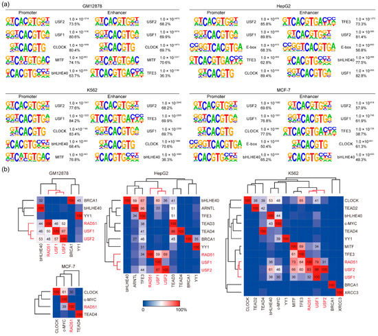 To discover DNA binding motifs recognized preferentially by RAD51, motif analysis was performed on the RAD51 peaks identified in GM12878, HepG2, K562, and MCF-7 cell lines. HOMER was used to assess overrepresented motifs in the flanking (150 bp) regions relative to the center of the RAD51 peaks. Surprisingly, the known binding motifs for the upstream stimulating factors (USF1 and USF2), followed by CLOCK, MITF, bHLHE40, and TFE3, were significantly overrepresented at the RAD51 binding sites in all four cell lines (Figure 2a). For example, a significant presence of the USF2 motif was found in RAD51 binding sites (73.5%) in GM12878 cells with a p-value of 1.0 × 10−1214. Notably, all of these transcription factors are known to bind to a consensus DNA element called an enhancer box (E-box), which harbors the palindromic DNA sequence “CACGTG”, and these E-box motifs were highly specific for RAD51 binding since motifs found at H3K4me3-enriched regions (active histone modification) in the same cell line were much less significant than the E-box motifs in terms of the p-value (Figure S2). In addition, there is no substantial difference in these motifs between the promoter and enhancer regions in all four cell lines (Figure 2a). Accordingly, these results led us to investigate a novel role for RAD51 in gene regulation besides the well-known enzymatic role in homologous recombination. Based on the above results (Figure 1 and Figure 2), we hypothesized that RAD51 could participate in gene regulation by binding to the target site with E-box binding proteins. To verify the hypothesis, we first reanalyzed available USF1, USF2, CLOCK, MITF, bHLHE40, and/or TFE3 ChIP-seq data in the ENCODE database to pinpoint which E-box binding transcription factors predominantly coincided with the RAD51 binding sites. Unfortunately, some of the E-box binding protein ChIP-seq data were not available. Therefore, only those available ChIP-seq data were reanalyzed for the analysis. The results showed that most RAD51 binding sites coincided with USF1 and/or USF2 in GM12878, HepG2, and K562 cell lines (Figure 2b). For instance, 52%, 69%, and 31% of RAD51 binding sites in GM12878, HepG2, and K562 cell lines, respectively, overlapped with USF2 peaks. Reciprocally, 48%, 29%, and 83% of USF2 binding sites in GM12878, HepG2, and K562 cell lines, respectively, coincided with RAD51 peaks. Almost similar results were obtained between RAD51 and USF1. Hierarchical clustering, based on the percentage of overlaps between the given proteins, indicated that RAD51, USF1, and USF2 were well-clustered among all E-box proteins reanalyzed in this study. This is an unexpected result because most, if not all, RAD51 studies never reported the co-localization of RAD51 and USF factors. To ascertain the finding, enrichment heatmaps were drawn, based on the binding sites of each protein, along with all available samples (Figure S3). The results confirmed that the RAD51 binding sites mostly coincided with USF1 and USF2 binding sites, followed by MITF and TFE3 peaks. In contrast, the binding sites of proteins known to be associated with RAD51 during homologous recombination, such as BRCA1, TEAD3, and TEAD4, rarely overlapped with the RAD51 binding sites. Overall, these results indicated that RAD51 could be involved in gene regulation with E-box binding proteins such as USF1, USF2, and/or MITF, which has not been addressed previously.