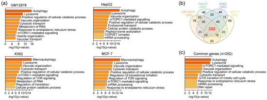 Gene ontology (GO) analysis was conducted using Metascape (http://metascape.org/, accessed on 12 March 2021) [35] with the genes closest to the top 500 peaks (descending order of RPKM values in Table S3) in each cell line.