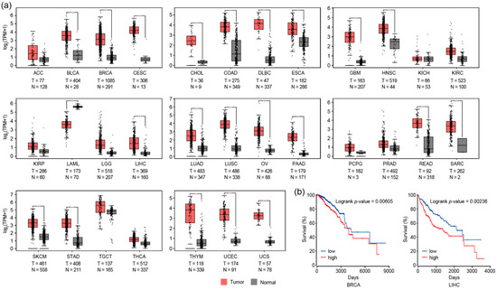 Expression levels of the RAD51 gene in various types of cancer. (a) Box plots show normalized expression levels (transcripts per kilobase million, TPM) of the RAD51 gene in tumor tissues and corresponding normal controls. *p-value < 0.01. (b) The prognosis of patients diagnosed with BRCA or LIHC was estimated and plotted in Kaplan–Meier survival plots. The patients were divided into two groups (high and low) based on the expression level of the RAD51 gene.