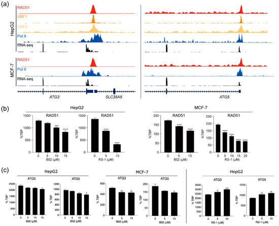 To further validate the predicted role of RAD51 in regulating autophagy-related pathways in vitro, we first checked expression levels of the RAD51 gene in various cancer cell lines (Figure S4). As expected, the RAD51 gene is highly expressed in most cancer cell lines. Next, we selected two key genes, ATG3 and ATG5, which are involved in the autophagy pathways, to test whether RAD51 could regulate the expression of those genes. These genes were selected since their promoters were strongly occupied by RAD51, RNA polymerase II, and/or USF1 and USF2 in the HepG2 and MCF-7 cell lines, and therefore they were highly expressed in these cell lines, as confirmed by RNA-seq (Figure 5a). To assess a novel regulatory role of RAD51 for these genes, we first investigated whether a reduction in RAD51 transcripts altered the expression levels of the ATG3 and ATG5 genes in the HepG2 and MCF-7 cell lines, using the small interfering RNA (siRNA) technique. Although the expression of RAD51 was significantly reduced in both cell lines, there were no significant changes in the expression levels of the ATG3 and ATG5 genes (Figure S5). This result suggests that the nuclear RAD51 protein may remain. Therefore, two compounds, a small molecule RAD51 inhibitor (B02) and a RAD51-stimulatory compound (RS-1), were used to disrupt or promote direct binding of RAD51 to DNA regulatory elements. When HepG2 and MCF-7 cells were treated with B02, the expression level of ATG3 and ATG5 genes was significantly reduced in a dose-dependent manner (Figure 5c). Conversely, the expression levels of ATG3 and ATG5 genes increased when treated with RS-1 in HepG2 cells (Figure 5c). These results suggest that RAD51 contributes to the regulation of autophagy-related genes, such as ATG3 and ATG5, in HepG2 and MCF-7 cells, in a DNA-binding-dependent manner. Further mechanistic studies are needed to fully support this hypothesis.