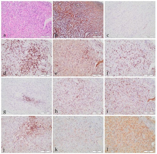 Pathological characterization of TIME in MPM. Histological appearance of MPM, epithelioid type (a), Ematoxilin & eosin (100×); reticulin stain showing connective tissue around neoplastic cells (b), (100×); SMA IHC stain showing scattered fibrocytes (c), (100×); CD3 IHC stain highlighting T lymphocytes (d), (100×); CD4 IHC stain showing scattered T cells (e), (100×); CD8 IHC stain showing moderate T lymphocyte infiltrate (f), (100×); CD20 IHC stain showing a small aggregate of B lymphocytes (g), (100×); CD68 IHC stain showing diffuse macrophage infiltration (h), (100×); CD163 IHC stain showing activated TAMs (i), (100×); PD-L1 IHC stain showing small aggregates of positive tumor cells (j), (100×); VISTA IHC stain showing moderate expression in immune cells (k), (100×); STING IHC stain showing diffuse immune cell positivity (l), (100×). Notes: TIME: tumor immune microenvironment; MPM: malignant pleural mesothelioma; SMA: smooth muscle actin; IHC: immunohistochemistry; PD-L1: programmed death ligand 1; VISTA: V-domain Ig-containing suppressor of T-cell activation; STING: STimulator of Interferon Genes.