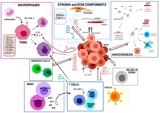 Macrophages are specialized phagocytic cells that play a dual role in cancer depending on their differentiation. Tumor-associated macrophages (TAMs) derive from circulating monocytic precursors and are the major component of MPM TIME (Figure 1h,i). They are divided into two classes: classically activated (M1) macrophages, which have pro-inflammatory, tissue destructive, and anti-tumor activity, and alternatively activated (M2) macrophages, which have pro-tumorigenic properties [68]. M2 macrophages are the ones mostly present in MPM and their differentiation is regulated by interleukins, such as IL-4, IL-13, and IL-10, produced by tumor-infiltrating lymphocytes (TILs) [69].