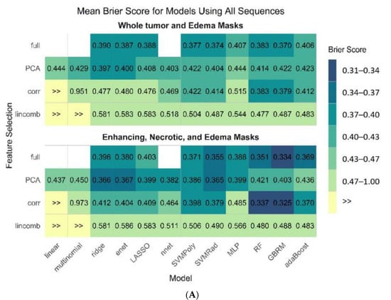 Figure 4A–C display the mean estimate of the cross-validated Brier score for all 45 model and feature selection combinations on both pipelines from all sequences, the best performing individual sequence (T1-CE), and the T1-CE sequence without the edema mask, respectively.