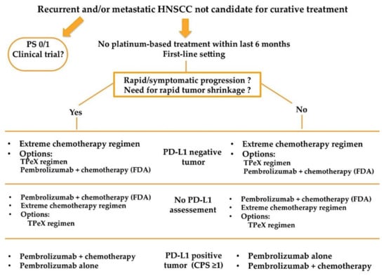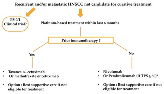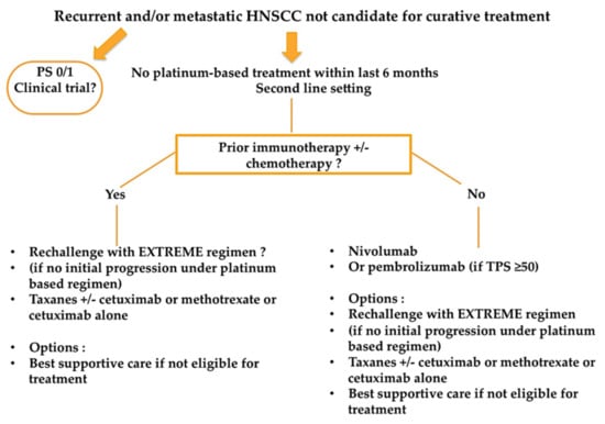 Results from the KEYNOTE-048 have recently been incorporated in the ESMO clinical practice guidelines for the treatment of recurrent and/or metastatic HNSCC patients [25]. Both Figure 1 and Figure 2 resume a proposed algorithm in the fist-line and second-line settings respectively.