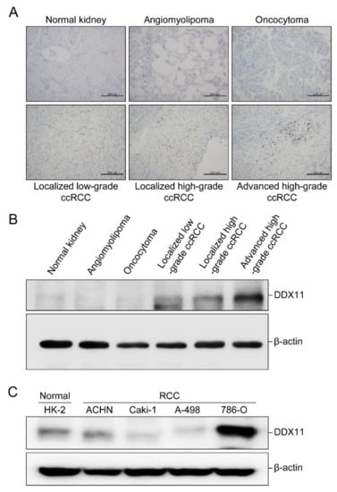 Subsequent immunoblot analysis revealed strong DDX11 expression in advanced and high-grade ccRCC, but no DDX11 expression was observed in normal kidney tissues or benign renal tumors (Figure 1B).