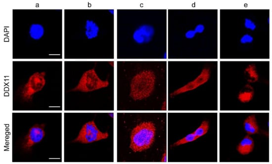 Because DDX11 is a nuclear protein, our results showed clear localization of DDX11 in the nucleus, especially during interphase, prophase, and metaphase. However, localization of DDX11 in the cytoplasm was also noted. This might be due to the dynamic localization of DDX11 during mitosis [11,12]. Parish et al. [11] and Bhattacharya et al. [12] reported dynamic localization of DDX11 during mitosis which is similar to our study. Further investigations on why nuclear protein, DDX11, is becoming localized in cytoplasm during mitosis should be performed.