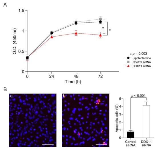 DDX11 knockdown in renal cell carcinoma cells resulted in the inhibition of proliferation and apoptosis. (A) Proliferation of 786-O cells that received only Lipofectamine (black-colored line) or were transfected with 25 nM of control siRNAs (gray-colored line) or 25 nM of DDX11 siRNA (red-colored line). The value at each time point following siRNA transfection is the mean of triplicate samples analyzed (* denotes p value with 0.003). (B) Apoptosis of 786-O cells transfected for 48 h with 50 nM of control siRNAs (a) or 50 nM of DDX11 siRNA (b) was analyzed using the TUNEL assay; TUNEL-positive cells (pseudocolored red), nuclei (pseudocolored blue), scale bar: 100 µm. Apoptosis of 786-O cells transfected for 48 h with 50 nM of control siRNAs (a) or 50 nM of DDX11 siRNA (b) was analyzed using the TUNEL assay.