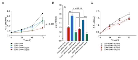 RCC cells transfected with DDX11 siRNA or control siRNA were treated with a clinically approved PARP inhibitor, olaparib; subsequently, cell proliferation was evaluated to investigate the association between DDX11 expression and the sensitivity to PARP inhibition. In response to treatment with olaparib alone, DDX11 siRNA-transfected RCC cells exhibited decreased viability (starting from 48 h) compared to those transfected with the control siRNAs and mostly showed significant differences (p < 0.001; 72 h time point). Thus, RCC cells with DDX11 knockdown exhibited increased sensitivity to olaparib (Figure 5A).