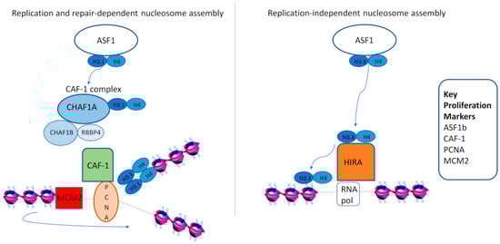 In replication- or repair-dependent nucleosome assembly, the histone chaperone complex CAF-1 has a critical role in depositing newly-synthesized histone variant H3.1/H4 dimers (delivered to CAF-1 by ASF1) onto DNA strands. The action of CAF-1 is mediated via its interaction with PCNA. In parallel, MCM2 binds and passes parental histones to replicating DNA strands. In contrast with CAF-1, the HIRA complex incorporates Asf1-donated H3.3/H4 histones to non-nucleosomal DNA, a process facilitated by the interaction of HIRA with RNA polymerase II. Key histone chaperones that have been used as proliferation markers are highlighted in the inset box in Figure 1.