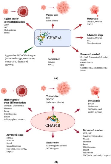 Correlation of CAF-1 expression with clinicopathologic parameters and survival. (A,B) CHAF1A and CHAF1B overexpression (red arrows) are associated with increased tumour size, higher grade, advanced stage, recurrence, metastasis, and reduced survival in tumours. Low expression of CHAF1A (green arrow) is associated with the aggressive biological behaviour of SCC of the tongue. (C) RBBP4 overexpression correlates with high grade, advanced stage, metastasis, and reduced survival in a subset of human cancers. This figure was created with BioRender.com. AML: acute myeloid leukaemia, MF: mycosis fungoides, NSCLC: non-small cell lung cancer, SCC: squamous cell carcinoma, HCC: hepatocellular carcinoma.