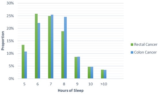 Differences in sleep quality by CRC site were evaluated with chi-square tests. This was performed for sleep hours (≤5, 6, 7, 8, 9, 10, >10 h) and binary variables (yes, no) such as problems staying awake, bad sleep quality, sleep medication, not sleeping within 30 min, waking up in the middle of the night, using the bathroom, pain, breathing/coughing/snoring, and no problems sleeping.