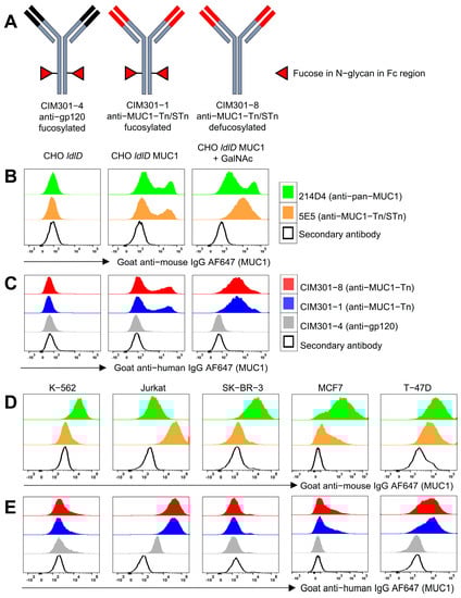 To further explore the therapeutic potential of anti-MUC1 antibodies for cancer immunotherapy, we generated fully humanized anti-MUC1 antibodies based on the 5E5 murine antibody (Figure 1A). The 5E5 antibody was previously shown to specifically recognize cancer-specific MUC1 epitopes (MUC1-Tn/STn) and elicits strong immune responses in mice [17]. In addition to a fully humanized 5E5 antibody (designated CIM301-1), we generated CIM301-8, a defucosylated variant of the antibody with the aim of optimizing antibody-dependent cellular cytotoxicity (ADCC). Lastly, we generated a control antibody, CIM301-4, directed against the non-relevant HIV-gp120 epitope (Table 1).