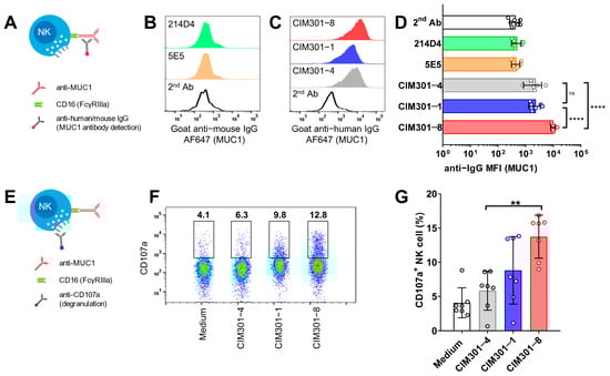 Monoclonal antibodies recognizing tumor antigens can induce ADCC through the binding of the antibody Fc tail to the FcγRIIIa (CD16) molecules on NK cells [6]. Therefore, we asked whether the humanized CIM-301 anti-MUC1 antibodies can indeed bind to NK cells (gating strategy in Figure S1A) by detecting labeled antibodies bound to the Fc portion of the anti-MUC1 antibody (Figure 2A). As expected, the murine anti-MUC1 antibodies did not bind to human NK cells (Figure 2B), while the fully humanized CIM301-1 and CIM301-8 antibodies showed robust binding to NK cells (Figure 2C). Notably, the defucosylated CIM301-8 displayed significantly stronger binding to Fc receptors on NK cells (Figure 2C,D), confirming that removal of oligosaccharides in the Fc region of the antibody could be beneficial for ADCC in NK cells [6]. Activation of NK cells by cross-linking CD16 with antibodies induces strong activation in NK cells without the need for other activation signals [24]. NK cell activation leads to degranulation, which can be measured as CD107a expression levels. Therefore, we determined whether incubation of NK cells with humanized anti-MUC1 antibodies induced CD107a expression (Figure 2E, with gating strategy in Figure S1B). Indeed, we found that incubation of primary NK cells with humanized anti-MUC1 only (without tumor cells) could induce degranulation (Figure 2F,G). Compared with the CIM301-4 control antibody, the defucosylated anti-MUC1 antibody CIM301-8 showed higher induction of NK cell activation. Thus, humanized anti-MUC1 antibodies bind to the FcγRIIIa receptor on human NK cells and can induce their activation, potentiating them to recognize and lyse MUC1-expressing tumor cells.