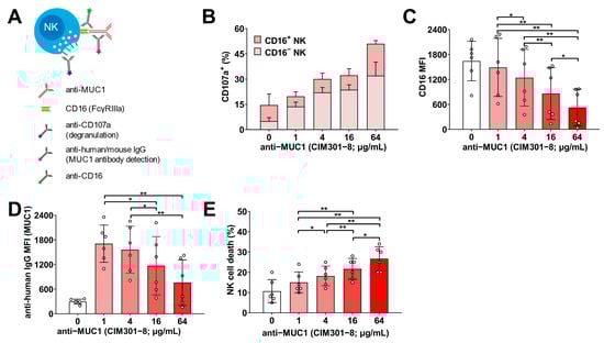 Increasing concentrations of humanized anti-MUC1 antibodies enhance degranulation and induce down-regulation of CD16 expression on NK cells. (A) Experimental setup for the detection of anti-MUC1 antibody binding to NK cells, inducing degranulation and down-modulation of CD16 on NK cells. Human NK cells were incubated with increasing concentrations of anti-MUC1 (CIM301-8; defucosylated Fc-tail). Antibody binding to CD16 was analyzed using flow cytometric analysis of anti-human IgG antibodies. (B) Stacked bars show the fraction of NK cell degranulation for CD16+ and CD16− NK populations in the presence of various antibody concentrations. (C) Quantification of CD16 expression on NK cells. (D) Quantification of anti-MUC1 antibody binding to the Fc tail of NK cells, shown as median fluorescence index (MFI) of anti-human IgG. (E) Quantification of NK cell death after 4 h incubation with increasing doses of anti-MUC1 antibody. Bars indicate mean ± SD, and dots are individual NK cell donors (n = 6 per experimental group). Statistical analysis using one-way ANOVA plus Tukey’s multiple comparisons test. p < 0.05 (*); p < 0.01 (**).