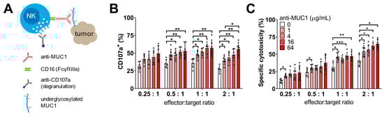 Lastly, we also titrated the antibody concentration in NK cell–Jurkat tumor cell co-culture experiments, using degranulation and specific cytotoxicity as readouts (Figure 4A). The addition of the anti-MUC1 antibody increased both degranulation and cytotoxicity against MUC1 Tn/STn+ Jurkat cells (Figure 4B,C; white bars versus red bars). However, we did observe a dose-dependent effect of the antibody-induced degranulation of NK cells (Figure 4B,C; shades of red), but this is not more than the increase that the direct effect of the antibody induced on the NK cells (Figure 3). Instead, the addition of extra NK cells (higher E:T ratios) was the main determinant of tumor cell killing (Figure 4C): in the presence of anti-MUC1 antibodies, the average tumor kill increased with on average 12.8% with every doubling of the E:T ratio. At the lowest E:T ratio tested (0.25:1), on average, 21.1% of the tumor cells were killed, while at the highest E:T ratio (2:1), this was 59.6%.