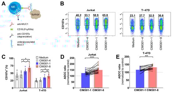 Next, we asked whether defucosylation of these humanized anti-MUC1 antibodies show more potent anti-tumor responses. We compared the regular anti-MUC1 antibody CIM301-1 to the defucosylated CIM301-8 antibody in degranulation and cytotoxicity assays against two MUC1-Tn+ tumor cell lines (Figure 5A). First, we performed NK cell-tumor cell co-culture experiments and determined whether both antibodies could enhance the activation of NK cells. Indeed, CIM301-1 and CIM301-8 both enhanced NK cell degranulation in co-cultures with Jurkat cells and T-47D cells compared to the control antibody (CIM301-4) (Figure 5B,C). In ADCC assays, both anti-MUC1 antibodies enhanced cytotoxicity against Jurkat (Figure 5D and Figure S4A) and T-47D cells (Figure 5E and Figure S4B). Compared to the control antibody, the regular antibody increased anti-Jurkat cell responses by 23%, while the defucosylated antibody increased cytotoxicity 49% (Figure 5D). For T-47D, the increases were 16% and 31%, respectively (Figure 5E). These effects were most pronounced at higher E:T ratios and with CIM301-8 antibodies (Figure S4). In summary, these newly generated humanized anti-MUC1 antibodies importantly enhance NK cell-mediated cytotoxicity against different MUC1-Tn/STn epitope-positive tumor cells. In line with results obtained with other antibodies [20,26,27,28], defucosylation of anti-MUC1 antibodies further enhanced anti-tumor responses.