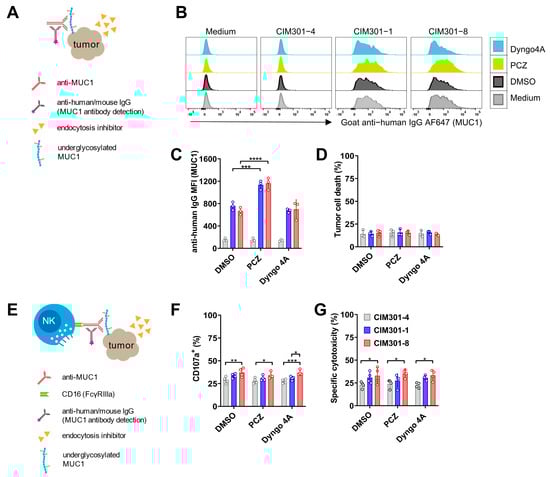 The endocytosis inhibitor PCZ promotes tumor antigen expression on T-47D cells but does not enhance antibody-dependent NK cell-mediated cytotoxicity. (A) Experimental setup to determine whether endocytosis inhibitors enhance MUC1 epitope availability on tumor cells. (B) Overlay histograms of flow cytometric analysis of MUC1 epitope expression on T-47D tumor cells in the presence of endocytosis inhibitors using regular (CIM301-1) or defucosylated (CIM301-8) anti-MUC1 antibodies or an irrelevant control antibody (CIM301-4). Anti-human IgG antibodies were used to detect antibody binding on tumor cells. Endocytosis inhibitors were dissolved in DMSO, here used as a negative control. One representative sample is shown. (C) Flow cytometric quantification of MFI of MUC1 expression levels on T-47D cells after treatment with endocytosis inhibitors as described in (B). Differences between control antibody (CIM301-4; grey bars) and anti-MUC1 antibodies (regular CIM301-1 in blue and defucosylated CIM301-8 in red) were all statistically significant with p < 0.0001. (D) Viability of T-47D tumor cells after incubation with anti-MUC1 antibodies with or without endocytosis inhibitors. Pooled data from three independent experiments performed at different timepoints. (E) Schematic overview of assays to test whether endocytosis inhibitors influence NK cell degranulation and cytotoxicity in the presence of anti-MUC1 antibodies. (F) Fraction of CD107a+ degranulating human NK cells in co-cultures with T-47D tumor cells at an effector/target ratio of 1:1 in the presence of anti-MUC1 antibodies and endocytosis inhibitors. NK cells and tumor cells were incubated for 4 h, with endocytosis inhibitors (5 μM PCZ, 30 μM Dyngo4A and 0.1% (v/v) DMSO) added during the last hour. (G) Antibody-dependent NK-cell-mediated cytotoxicity against T-47D tumor cells. Experimental setup as in (F). Panels (F,G) show pooled data from four independent experiments with different donors, performed at different time points. Differences between groups were determined using two-way ANOVA with Tukey’s multiple comparisons test. p < 0.05 (*); p < 0.01 (**); p < 0.001 (***); p < 0.0001 (****).
