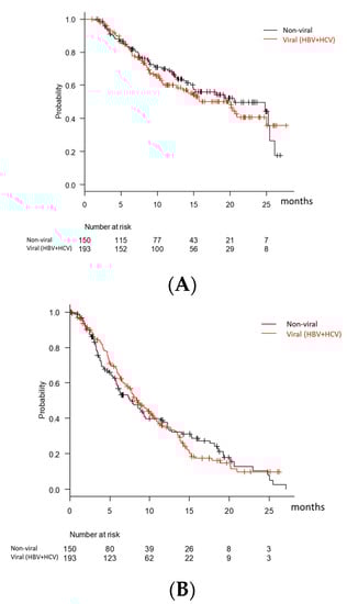 In this cohort, 97 of 343 (28.3%) patients had an experience of MTT. As the second-line therapy (after sorafenib), 51 patients received LEN, and one patient was treated with checkpoint inhibitors before LEN. Furthermore, 44 patients received LEN as the third-line (after sorafenib-regorafenib [n = 41], brivanib-sorafenib (n = 1), sorafenib-cabozantinib [n = 2]). One patient received LEN as the fourth-line after sorafenib, regorafenib, and cabozantinib. The comparison of the baseline characteristics of the MTT-naïve and experienced patients is shown in Table 2. The MTT-experienced patients showed younger age, lower albumin levels, higher ALBI scores, a higher rate of extrahepatic metastasis, and a lower incidence of MVI than the MTT-naïve patients. However, there were no differences in sex, total bilirubin, pretreatment AFP level between the two groups. The treatment duration of LEN was not significantly different between MTT naïve and experienced patients. The OS and PFS, according to BCLC stage, MTT experience, and ALBI grade in Child-Pugh A patients was shown in Table 3. The intrahepatic tumor status was beyond the up to seven criteria in 102 (77.3%) of 132 patients with BCLC stage B and Child-Pugh A. Additional TACE during LEN was performed in 27 patients to achieve CR or maintain DCR. Among them, median OS and PFS were 25.4 and 15.0 months. The statistical comparisons according to BCLC stage, MTT experience, and ALBI grade were shown in Table 4. There were no significant differences in OS and PFS, according to the etiology (viral vs. non-viral) (p = 0.48 and p = 0.88) (Figure 1A,B). We performed analyses about OS and PFS according to the inclusion criteria of the REFLECT study. In the REFLECT study [5], patients with 50% or higher liver occupation, obvious invasion of the bile duct, invasion at the main portal vein, or previous systemic therapy for HCC were excluded. The median OS and PFS in the patients (n = 174) who completely met the inclusion criteria of the REFLECT study [5] were 25.3 and 10.0 months, while the median OS and PFS in the patients (n = 71) who met the inclusion criteria except for the experience of previous systemic therapy for HCC were 15.2 and 7.1 months.