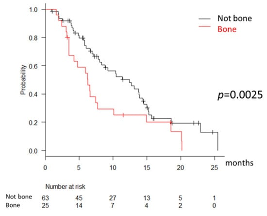 As extrahepatic metastatic sites, lung (n = 65), bone (n = 34), and adrenal gland (n = 19) were reported. In Child-Pugh A and MTT naïve patients (n = 88), the median PFS in the patients with bone metastasis and no MVI was significantly shorter than the patients with lung or adrenal gland metastasis and no MVI (6.3 vs. 12.5 months, p = 0.0025, Figure 2). The median OS between the two groups was not significantly different (20.2 vs. 25.5 months, p = 0.27). There were no significant differences in the pretreatment characteristics, including age, body weight, ALBI score, AST, and AFP level between the two groups.