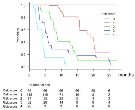 We analyzed the survival probability using the scores calculated by the risk factors associated with mortality in lenvatinib therapy. Cox regression coefficients (β) were multiplied by a factor of 5 and round to the nearest unit to facilitate our prognostic point calculation. The final model was prognostic point = Performance Status (≤0 = 0, >0 = 1) + ALBI grade (ALBI grade 1 or modified ALBI 2a = 0, modified ALBI 2b or 3 = 1) + AFP (<400 ng/mL = 0, ≥400 ng/mL = 1) + Major vascular invasion (No = 0, Yes = 1) + MTT experience (No = 0, Yes = 1). Based on the Youden index, a point of 2.0 was calculated as the cut-off for categorizing patients as being at low-risk (≤2) or high-risk (>2) of poor overall survival (<12 months) after lenvatinib therapy, and the cut-off revealed a sensitivity of 71.9% and specificity of 86.1%. The area under the receiver operating characteristic curve (AUC) of the model was 0.859 (95% CI: 0.821–0.897). No patient with a risk score of 0 (n = 66) died during the observation period, and the median OS in patients with risk score of 1 (n = 118) was 19.2 months (Figure 3).