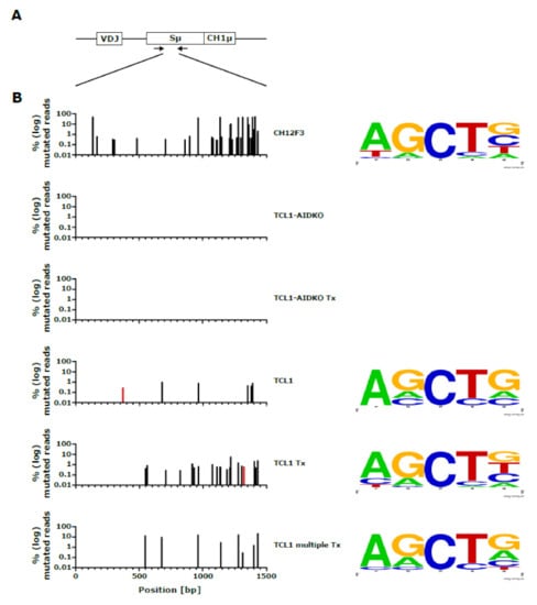 To further validate AID activity in TCL1 tumors, we performed mutation analysis of PCR-amplified IgM switch regions (Sµ region) by NGS-based sequence analysis of sorted CLL cells from primary TCL1, TCL1 Tx, primary TCL1-AIDKO, TCL1-AIDKO Tx (n = 3 each) and TCL1 multiple Tx (n = 2) samples (Figure 4A). In addition, CH12F3 cells stimulated to induce CSR were analyzed as a positive control [29]. As expected, we found increased mutation rates in this region within the TCL1 cohort, but no mutations in the TCL1-AIDKO cohort (Figure 4B,C). These mutations were characterized by increased frequency upon transplantation (Figure 4D), a dominance of C>T transitions (Figure 4E) and preferentially located within the typical AID WRCY/RGYW motif (Figure 4B). This analysis provides further evidence for AID-dependent mutational activity in the TCL1 cohort compared to the TCL1-AIDKO cohort.