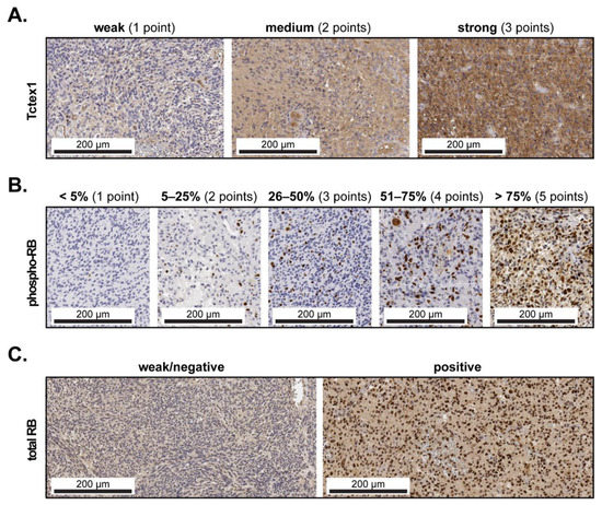 Tctex1 exhibited, mainly, a cytoplasmic subcellular localization. The expression intensity of Tctex1 was categorized as ‘’weak“, ‘’medium“ or ‘’strong“ and was assigned 1, 2 or 3 points, respectively (Figure 1A). As a number of samples exhibited heterogenous staining, Tctex1 expression was subsequently graded using the H-Score according to the formula: (1 × X) + (2 × Y) + (3 × Z), where X + Y + Z = 100% of the total tumor area. Phospho-RB, which exhibited exclusively a nuclear localization, was assessed as percentage of positive cells using a 5-tier scoring system (Figure 1B). At least two different fields per TMA spot were analyzed at 200-fold magnification, and the values were subsequently averaged. Total RB exhibited mostly nuclear and some cytoplasmic subcellular localization. The staining pattern was mostly homogenous, and the samples were subsequently categorized as ‘’weak/negative” or ‘’positive” (Figure 1C).