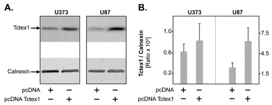To assess the role of Tctex1 in GBM biology and functions, we first established an in vitro model of Tctex1 overexpression. To this end, two GBM cell lines (U373 and U87) were stably transfected to overexpress Tctex1. A representative example of Tctex1 protein levels in GBM cells transfected with the overexpression plasmid (pcDNA Tctex1) versus control plasmid (pcDNA) are shown in Figure 3A,B. The corresponding original western blots are shown in supplementary Figures S2 and S3, respectively.