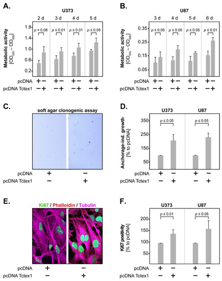 Next, we determined the metabolic activity of transfected GBM cells, using the MTT assay. The results showed that Tctex1 overexpression significantly increased metabolic activity in both U373 and U87 cells, starting at 3 days in culture (Figure 4A,B). We additionally determined the anchorage-independent growth of transfected GBM cells by allowing the cells to form colonies in low-gelling agarose for 15 days (Figure 4C). We found that both U373 and U87 pcDNA Tctex1 cells formed significantly more colonies than their pcDNA counterparts (Figure 4D). Finally, we assessed the staining intensity of the specific proliferation marker, Ki67, by immunofluorescence (Figure 4E). The results showed that Tctex1-overexpressing cells had significantly higher Ki67 positivity compared to control in both U373 and U87 cell lines (Figure 4F). Taken together, these data indicate that Tctex1 promotes the proliferation of GBM cells.