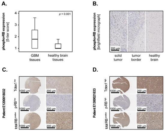 Previous studies proposed that the effect of Tctex1 on cell cycling and proliferation was mediated via phosphorylation of the retinoblastoma protein (RB) [9]. To test this hypothesis, we stained TMAs from GBM patients with specific antibodies against the phosphorylated form of RB. The samples were, additionally, stained against the total form of RB. The expression levels of phospho-RB in matched GBM–healthy brain tissue pairs were displayed as box–whisker plots, and the significance was tested with the Wilcoxon test. Similar to Tctex1, phospho-RB was significantly increased in GBM compared to the tumor-free brain tissues (p = 0.001; Wilcoxon) (Figure 5A). Representative examples of phospho-RB expression in GBM versus tumor-free tissues are shown in Figure 5B—left and right panels, respectively—while the middle panel depicts the border area (Figure 5B). To determine the relationship between phospho-RB and Tctex1 in GBM patients (n = 108), we performed correlation analysis using Spearman’s rank test. The results showed that phospho-RB directly and significantly correlated with Tctex1 in these tissues (p = 0.007, Rho = 0.284, Spearman’s rank). In contrast, the total levels of RB did not correlate with Tctex1 in these patients (p = 0.836, Rho = 0.020, Spearman’s rank). Representative examples of synchronous low and high levels of Tctex1/phospho-RB are shown in Figure 5C,D, respectively (upper and middle panels). The lower panels depict the expression levels of total RB in these samples (Figure 5C,D).