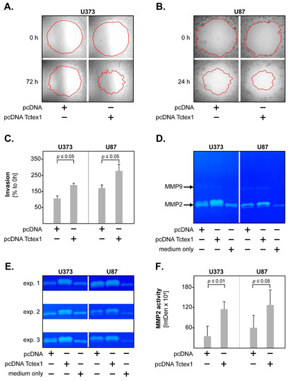 As matrix metalloproteases (MMPs) were known to promote the invasion of GBM cells [23,24,25,26], we also determined the activity of released MMPs using gelatin zymography. To this end, pcDNA and pcDNA Tctex1 GBM cells were incubated in culture medium, and the supernatants were collected at 48 h (U373) or 24 h (U87). Culture medium without cells was used as control. We found that both U373 and U87 cells released relatively high levels of MMP2, but only negligible levels of MMP9 (Figure 6D). Importantly, Tctex1-overexpressing GBM cells had significantly higher levels of MMP2 compared to their control-transfected counterparts (Figure 6E,F). Together, these findings indicate that Tctex1 enhances GBM invasiveness, possibly via MMP2.