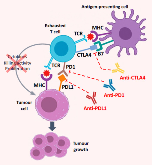 Mechanism of action of immune checkpoint inhibitors (antibodies that target CTLA4, PD1, or PDL1) in the HCC tumour microenvironment, where chronic inflammation and cirrhosis lead to immune exhaustion. Exhausted T cells have a reduced capacity to produce cytokines, to proliferate, and to kill tumour cells; tumour growth is facilitated by blockade of signalling resulting from interaction of the T-cell receptor (TCR) with the major histocompatibility complex (MHC). Key actionable drivers of immune exhaustion in HCC are the PD1–PDL1 pathway and CTLA4 signalling, and blockade of these pathways (i.e., immune checkpoint inhibition) enhances the immune reaction against the tumour cells [32,33]. (Adapted from Giannini et al. 2019 [33].)