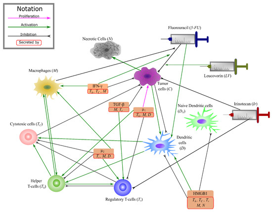 There is a complex web of numerous interactions in the colon cancer microenvironment. To be able to analyse and study the role of key interactions in tumors’ progression, the network of these interactions has been reduced to a clear and compact model in [48], highlighting the key components. This network model contains 14 variables that can be majorly grouped into T-cells, dendritic cells, macrophages, cytokines, cancer cells and necrotic cells. In this paper, we add the interactions of three FOLFIRI agents to this network to study the effect of these drugs on colonic tumors (Figure 1 and Table 1).