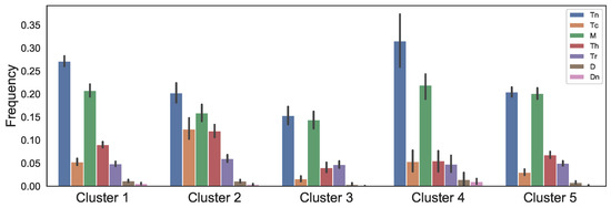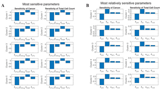 In our previous study, K-means clustering of colon tumors based on their immune cells’ frequencies indicates that there are five distinct immune patterns of colonic tumors [48]. In this paper, we investigate the effect of FOLFIRI drugs on the same five distinct clusters. In each cluster, average immune cell frequencies that we use in the dynamical model have been shown in Figure 2, where the vertical bars show the standard deviations.
