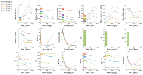 Based on our ODE system, we can infer that the increase in helper T-cells and cytotoxic cells is due to the activation rates and , that are modelled after the indirect activation of T-cells by dendritic cells and 5-FU [104]. On the other hand, the decline in T-reg cells must be due to the inhibitory effect of Irinotecan on T-reg cells, modelled in Equation (20) by the parameter . We have described macrophages to have an inhibitory effect on the cytotoxic action of 5-FU, but they themselves are not affected by this interaction, because this is the only interaction modelled between macrophages and the drugs in our network (as seen in Figure 1). Note, the small spikes of macrophages may be attributed to the activation rate of macrophages by T-helper cells, , as 5-FU has an interaction with T-helper cells. Since we include the activation rates for helper and cytotoxic T-cells in the equation for naive T-cells (Equation (19)), the decrease in the density of naive cells is also reasonable. The small effect on dendritic cells, both naive and active can be explained by the parameter , since this parameter is linked to the density of cancer cells. For all the clusters, there is a rapid decline in the cancer cell density during treatment. Cluster 3 reaches the minimum cancer value among the clusters which is quite close to zero. Since the amount of necrotic cells increases with the decrease in cancer cells, it is reasonable to see it increases during treatment. Moreover, IFN- is not directly affected by any of the drugs, however, since helper T-cells increase during treatment this must also increase the value of IFN-. Cytokines, , , HMGB1 and TGF- are all indirectly affected as per their interactions with macrophages, T-cells and dendritic cells in the tumor network Figure 1.