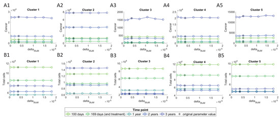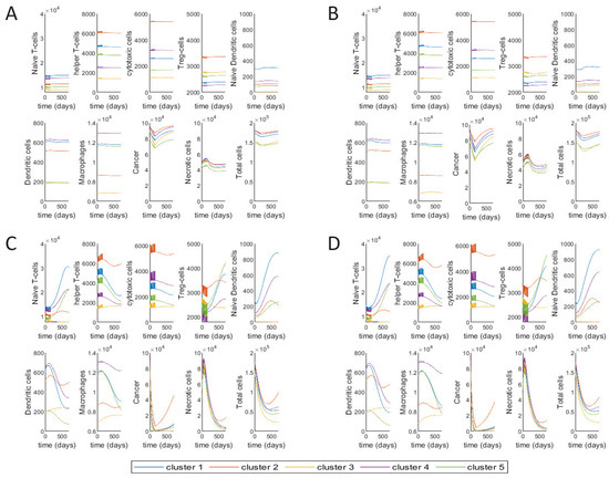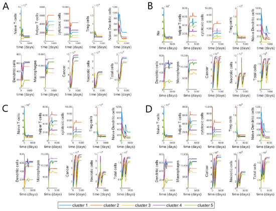Giving the treatment at a later time, delays the time it takes for the cells to reach their steady states. As discussed previously, the cell dynamics are effected only during treatment, but the treatment does not change the overall dynamics, and we can observe the same effect here. In Figure 5A, cluster 5 has the lowest number of cancer cells after treatment, while in the other Figure 5B–D when the treatment is given after 3 years or later, cluster 3 reaches the lowest number of cancer cells after treatment. In Figure 5C,D, all cells seem to have already reached or very close to reaching their steady-states. Hence, there is not much of a difference between the dynamics in these cells between the plots C and D, except that the effect of the treatment is seen at a later time. In Figure 5D, since the treatment is given after about 7 years all the cells, including cancer and necrotic cells have already reached their steady states and therefore the dynamics is identical to that in Figure 3. As also observed in Figure 3 and Figure 4, cluster 3 shows some unique behavior compared to the other clusters. The number of dendritic cells in the other clusters is much higher than their initial value, but for cluster 3 it decreases after treatment and reaches to the same steady state value as cluster 5. Cluster 3 has the lowest number of total cells after the treatment in all plots, but cluster 5 has the lowest steady state value for cancer, necrotic and total cells.