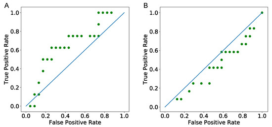 ROC Curves of the model. (A,B) are generated using predicted cancer cells number in the first day of follow up and the last day of follow up of the patients, and AUC values are 0.53 and 0.41, respectively.